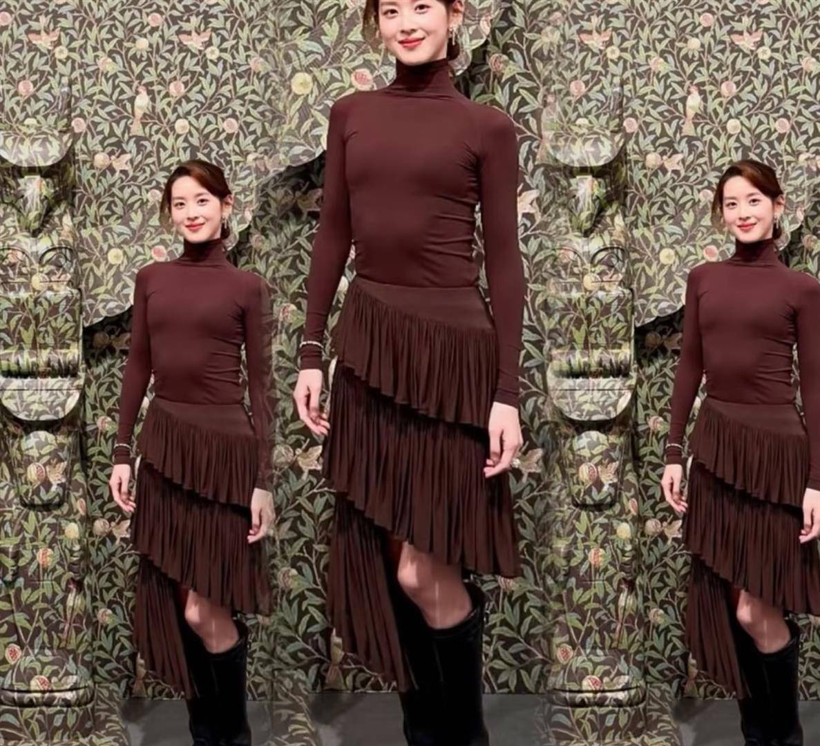 更绝的是她对色彩的把控能力。第三套造型选择了棕色调高领上衣搭配不对称褶裥裙,脚踩黑色长筒靴站在复古壁纸前,温柔得像从油画里走出来的人。这种低饱和度的莫兰迪色系特别显气质,既不会喧宾夺主抢了艺术品的风头,又能让自己成为画面里最和谐的存在。网友忍不住调侃:“刘强东这哪是娶了老婆,分明是娶了个行走的时尚icon!”
